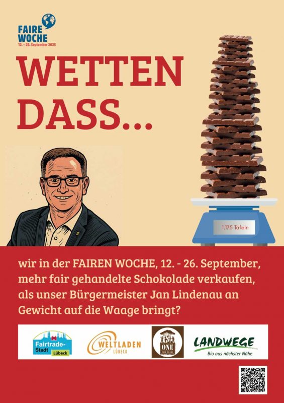 Mit dem Start der Fairen Wochen, am Freitag, 12.9., beginnt auch die Wette zwischen Bürgermeister Jan Lindenau und Lübecker Akteuren des Fairen Handels. Der Verein Fairtrade Stadt Lübeck wettet, dass in der Zeit vom 12. bis zum 26. September im Weltladen, ONE Fair Trade Café und Shop, in den Filialen von Landwege und in dem Hotel zur Marienkirche mehr fair gehandelte Schokolade verkauft wird, als Bürgermeister Jan Lindenau an Gewicht auf die Waage bringt. Alle Lübeckerinnen und Lübecker sind aufgefordert mitzumachen.