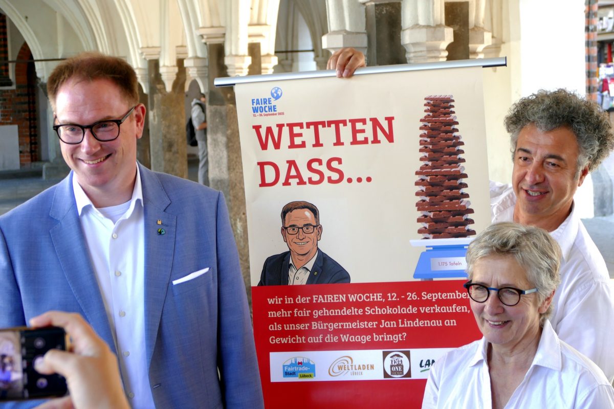 Mit dem Start der Fairen Wochen, am Freitag, 12.9., beginnt auch die Wette zwischen Bürgermeister Jan Lindenau und Lübecker Akteuren des Fairen Handels. Der Verein Fairtrade Stadt Lübeck wettet, dass in der Zeit vom 12. bis zum 26. September im Weltladen, ONE Fair Trade Café und Shop, in den Filialen von Landwege und in dem Hotel zur Marienkirche mehr fair gehandelte Schokolade verkauft wird, als Bürgermeister Jan Lindenau an Gewicht auf die Waage bringt. Alle Lübeckerinnen und Lübecker sind aufgefordert mitzumachen.